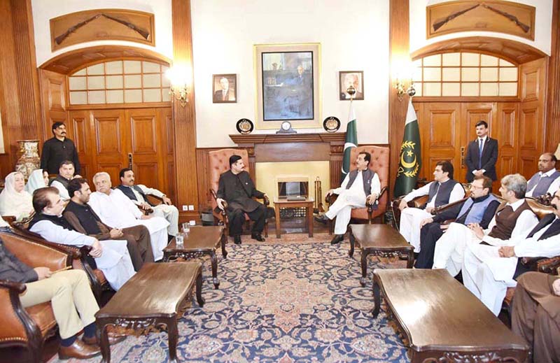 APP53-011025 PESHAWAR: October 01 – APP54-011025 PESHAWAR: October 01 – Acting President Syed Yousuf Raza Gilani in a meeting with opposition members of Khyber Pakhtunkhwa Assembly at the Governor House. APP/TZD