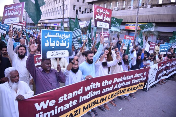 KARACHI: February 28 - Activists of the Central Muslim League hold a rally in support of the Pakistan Army outside the Karachi Press Club. APP/SDQ/ABB