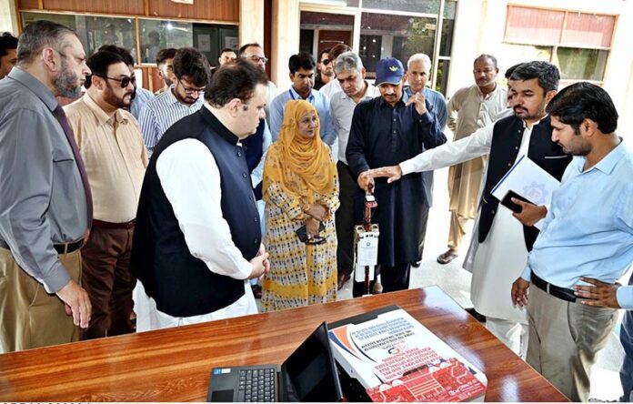 Additional Chief Secretary South Punjab Fawad Hashim Rabbani inspecting the electrical white stick for the blind made by the students at the Muhammad Nawaz Sharif University of Engineering & Technology. Vice Chancellor Professor Dr. Kamran Khan and students are also present.