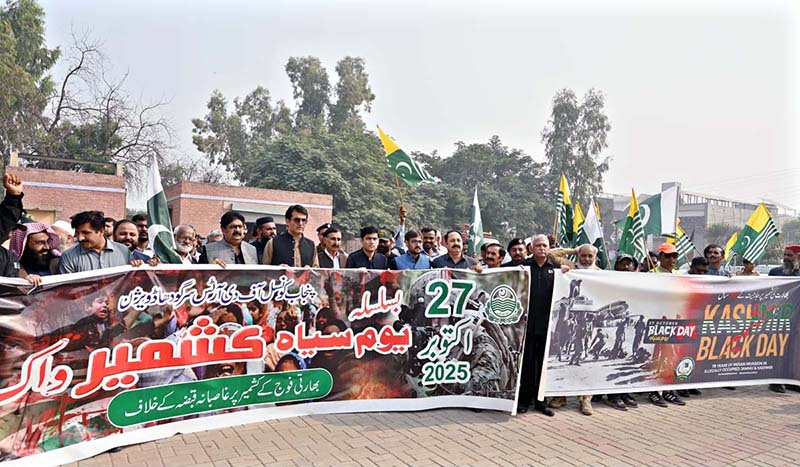 SARGODHA: October 27 β Additional Deputy Commissioner General Muhammad Abu Bakr Rana leads a walk organized at Sargodha Arts Council to mark Kashmir Black Day and express solidarity with the people of Indian Illegally Occupied Jammu and Kashmir. APP/HSD/MAF/TZD/SSH