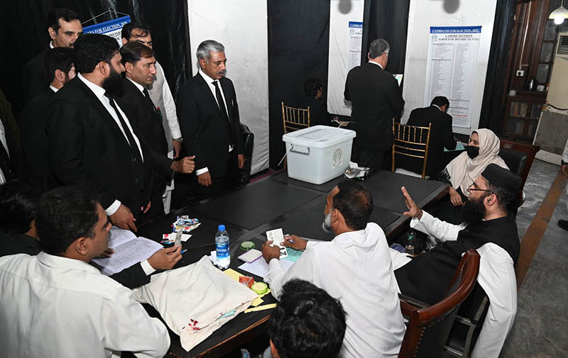 Advocate General Punjab Amjad Pervaiz and Returning Officer for Punjab Bar Council elections visiting polling booths during the Punjab Bar Council elections at the Lahore High Court.