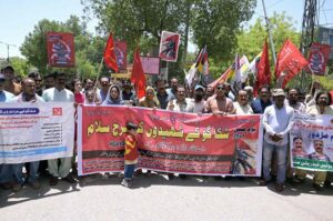 HYDERABAD: April 01 – All Pakistan Clerk Association (APCA) workers participants in rally to mark World Labour Day outside Press Club as International Labour Day is celebrated on May 1 every year. It’s a day to honour and appreciate the contributions of workers all around the world. This day recognizes the hard work and dedication of people who work in various fields to make our lives better.