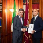 ISLAMABAD: February 01 – President Pakistan Students Olympic Association, Maqbool Arain presenting shield to Ambassador of Kazakhstan to Pakistan, H.E. Yerzhan Kistafin during opening ceremony of National Students Olympic Games-2024 at Liaquat Gymnasium, Pakistan Sports Complex.