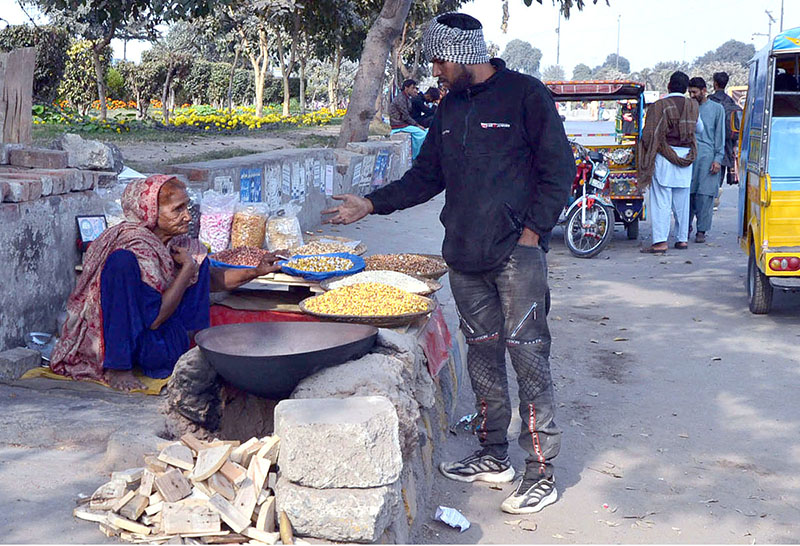 An aged woman sells gram and maize grains roasted on a clay stove in at Shahdra Morr roadside stop