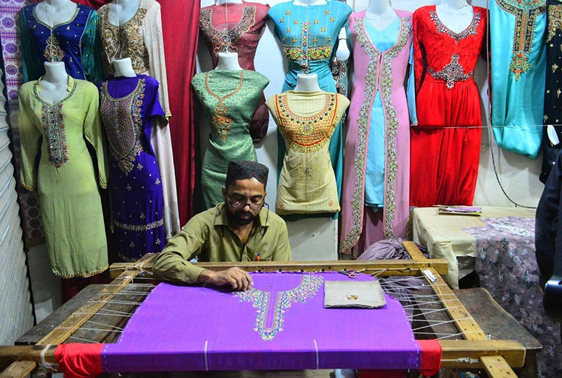 An artisan creates intricate beautiful embroidery designs on women’s clothing at his workplace ahead of Eid-ul-Fitr.