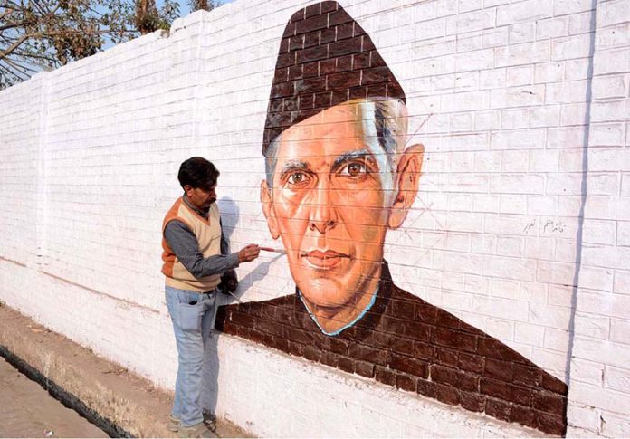 An artist puts the final touches on a portrait of Quaid-e-Azam Muhammad Ali Jinnah on wall ahead of his death anniversary.