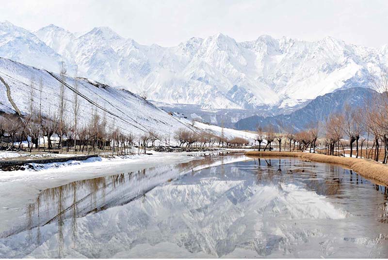 SKARDU: January 30 - An attractive and eye catching view of reflection of snow covered mountain and leafless tree's in Katpana Desert Lake during the 1st snow fall in the area. APP/AHS/MAF/TZD/ABB