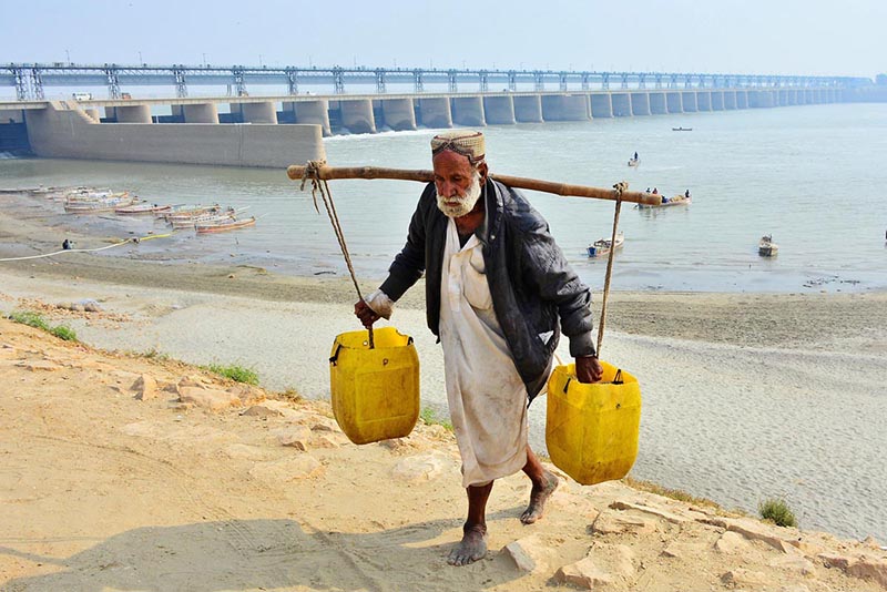 An elderly person carries water cans after filling them at the Indus River. APP05-110226HYDERABAD: February 11 – Previous Post Federal Minister for Planning, Development & Special Initiatives, Prof. Ahsan Iqbal addressing during two-day “National Curriculum Summit 2026” at AIOU. Next Post Fishermen are busy catching fish on the boat at Indus River.