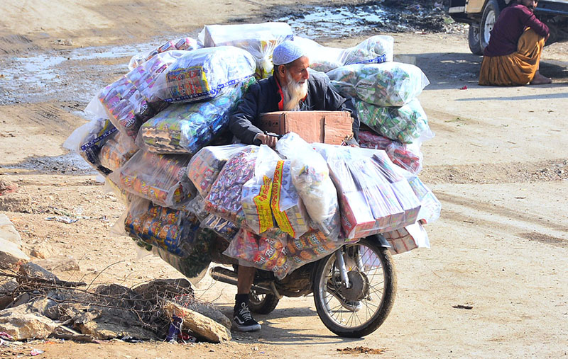 HYDERABAD: December 29 - An elderly person on the way on his motorcycle loaded with chips bags to deliver them to various shops at Latifabad. APP/FHN/MAF/TZD