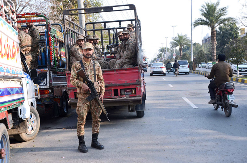 APP80-070224 FAISALABAD: February 07 – . APP81-070224 FAISALABAD: February 07 – Army personnel standing alert on the eve of General Elections 2024 at University Road. APP/TWR/ABB