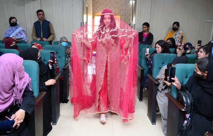 PESHAWAR: November 14 – Art and Design students perform a cultural wedding-themed show on stage during the closing ceremony of the 3rd edition of the Dosti Peshawar Women’s Literature Festival 2025 at SBBWU. APP/SYR/MAF/FHA/SSH