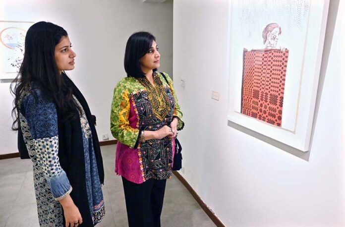 ISLAMABAD: October 10 – Art enthusiasts keenly observing the collaborative exhibition titled “Diptych” by artists Sarah Hopkins and Muhammad Atif Khan at Tanzara Gallery Saidpur Village in the Federal Capital. APP/SMR/MAF/TZD/ABB