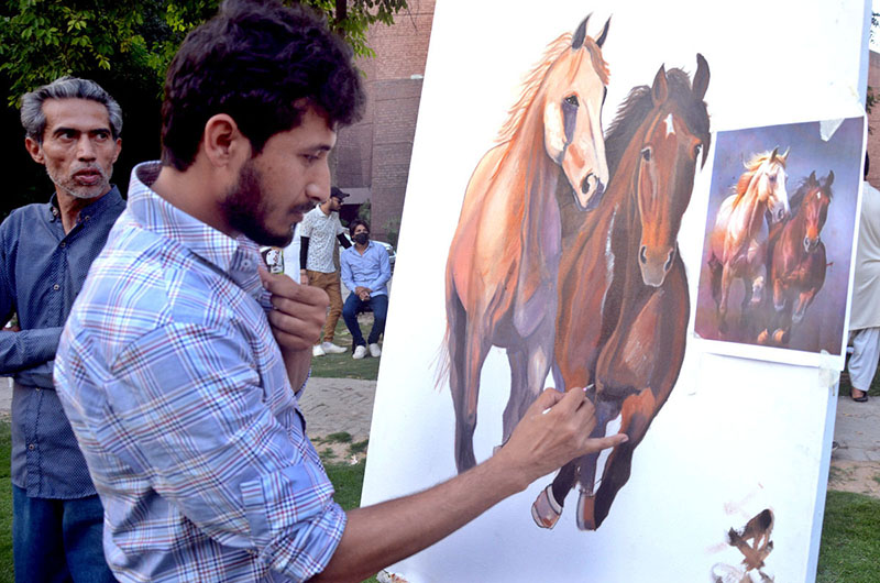 LAHORE: May 14 – Art students giving final touch to his painting at Alhamra Academy of Performing Arts.