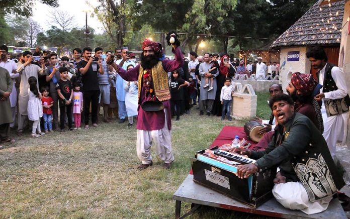 Artist performing balochi cultural dance during Saqafati Mela promoting Pakistani culture providing entertainment to public at Lok Virsa