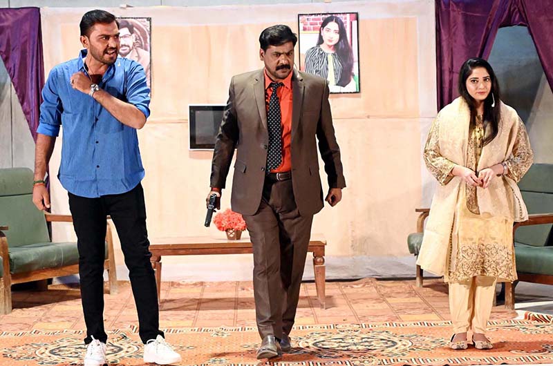 Artists performing in the drama “ Khali Botal (Empty Bottle)” during Drama Festival at Z.A. Bhutto Open Air Theater, Arts Council.