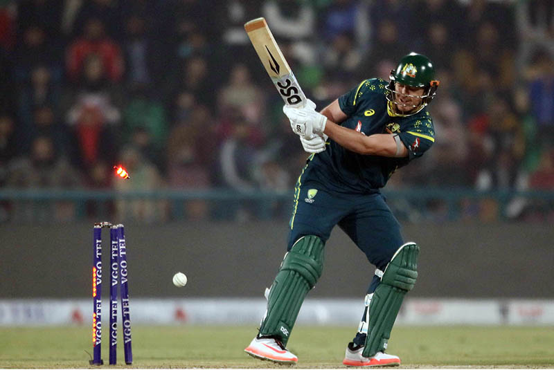 Australia’s batter Matthew Renshaw bowled out by Shaheen Afridi during the third Twenty20 international cricket match between Pakistan and Australia at the Gaddafi Stadium