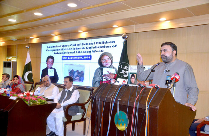 QUETTA: September 12 – Balochistan Chief Minister, Mir Sarfraz Bugti addressing at the ceremony of launch of Zero Out of School Children Campaign Balochistan & Celebration of International Literacy Week.