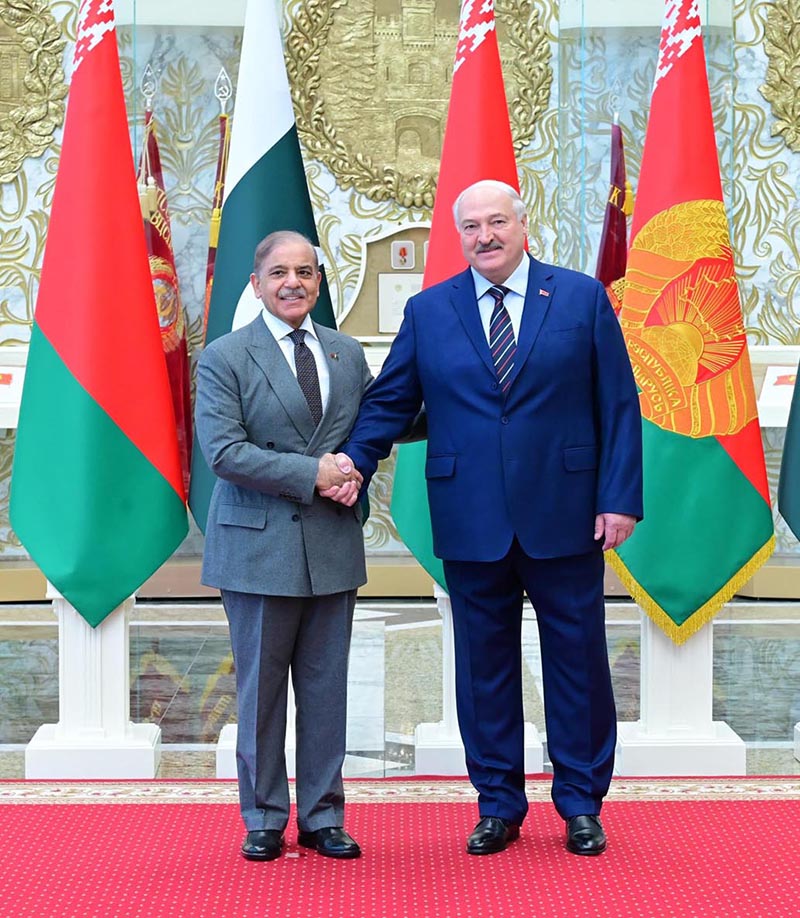 MINSK: April 11 – Belarusian President H.E. Aleksandr Lukashenko and Prime Minister Muhammad Shehbaz Sharif shake hands at the Independence Palace of Belarus. APP/MAF/FHA