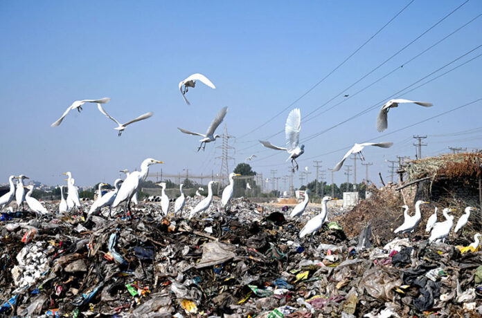 Birds flock hovering and sitting on garbage piles and searching food for survive at Sarmast Road