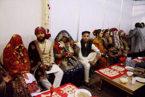 Brides and grooms sit together during a mass marriage ceremony held in Railway ground, a total of 122 couples from the Hindu community across Pakistan took their wedding vows during the mass wedding ceremony organized by the Pakistan Hindu Council
