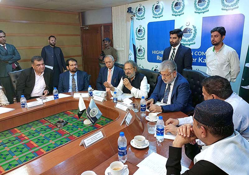 Caretaker Federal Minister for Education and Professional Training Madad Ali Sindhi chairing a meeting with vice chancellors of public sector universities of Sindh at Higher Education Commission’s Regional Office