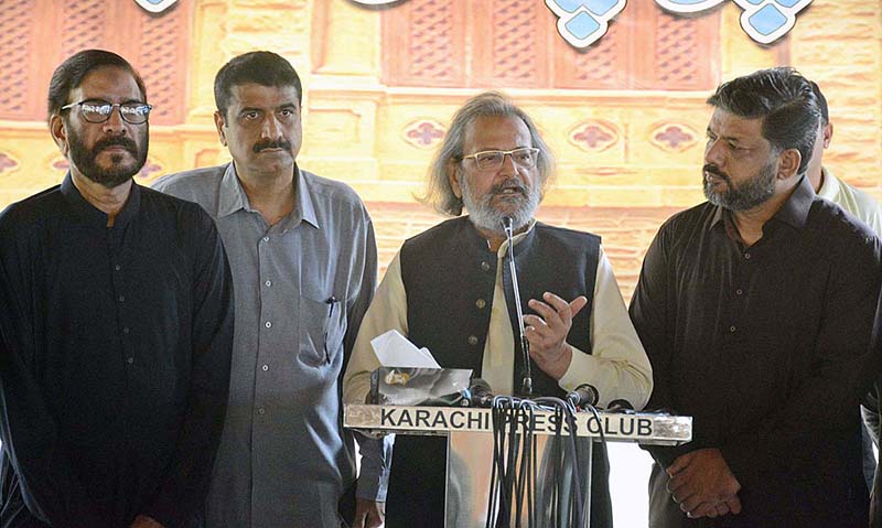 KARACHI: September 03 – Caretaker Federal Minister for Education and Professional Training Madad Ali Sindhi talking to media persons at Karachi Press Club. APP/SDQ/TZD/ZID