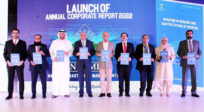 Caretaker Federal Minister for Planning and Development Muhammad Sami Saeed in a group photo during the launch of Annual Corporate Report 2022 of NDRMF project "Optimizing Impact-Investing in Resilient and Adaptive Future of Pakistan