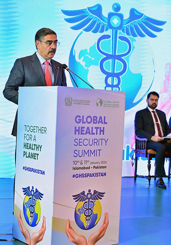 ISLAMABAD: January 10 – Caretaker Prime Minister Anwaar-ul-Haq Kakar addresses the Global Health Security Summit.