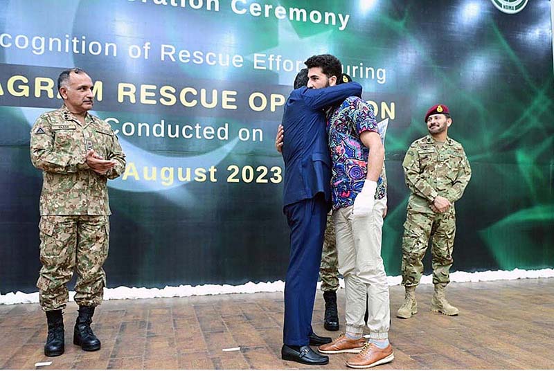 Caretaker Prime Minister Anwaar-ul-Haq Kakar awarding appreciation certificates to the rescuers of Battagram chairlift incident at a ceremony in Prime Minister’s Office.