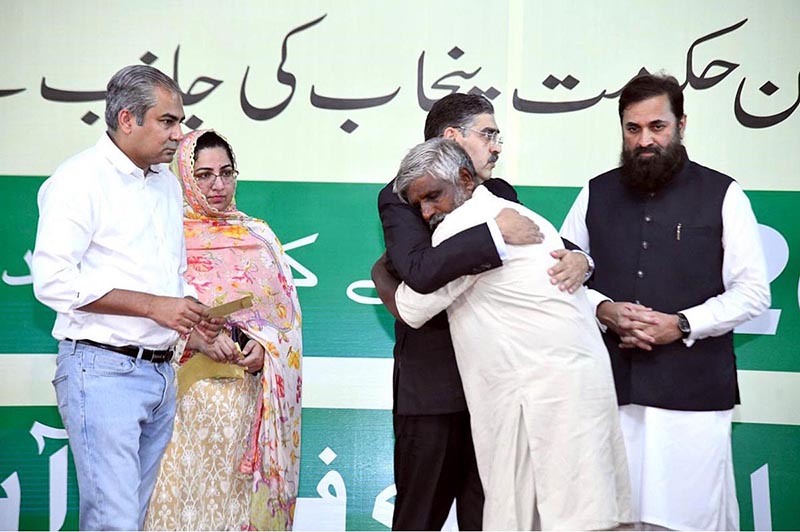 FAISALABAD: August 21 - Caretaker Prime Minister Anwaar-ul-Haq Kakar distributes cheques of 2 million rupees each to individuals from the Christian community whose residences were damaged due to mob violence in Tehsil Jaranwala. APP/FHA/ZID