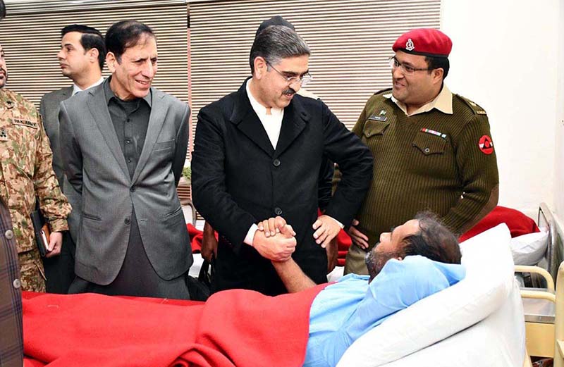 Caretaker Prime Minister Anwaar-ul-Haq Kakar enquiring about the health of those injured in the Dera Ismail Khan blast during his visit of CMH D.I.Khan