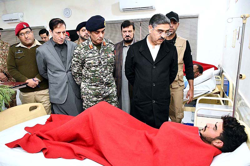 Caretaker Prime Minister Anwaar-ul-Haq Kakar enquiring about the health of those injured in the Dera Ismail Khan blast during his visit of CMH D.I.Khan