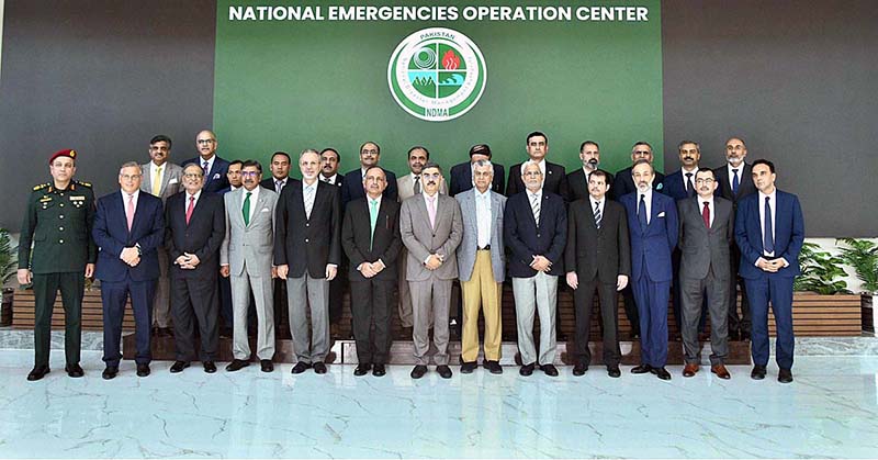 Caretaker Prime Minister Anwaar-ul-Haq Kakar in a group photo with NDMA’s team after the inauguration of National Emergencies Operation Center in Islamabad