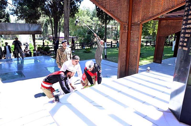 Caretaker Prime Minister Anwaar-ul-Haq Kakar lays down a floral wreath on the Yadgaar-e-Shuhada