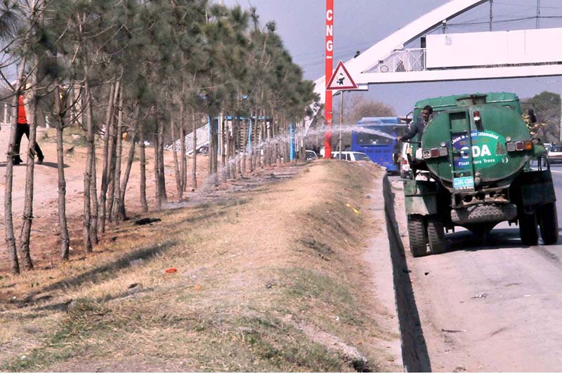 HomePhotosGeneral Coverage PhotosCDA worker busy in watering plants on green belts at Express way