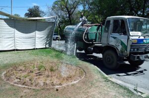 CDA worker busy watering plants on green belt at G-7 Area in the Federal Capital