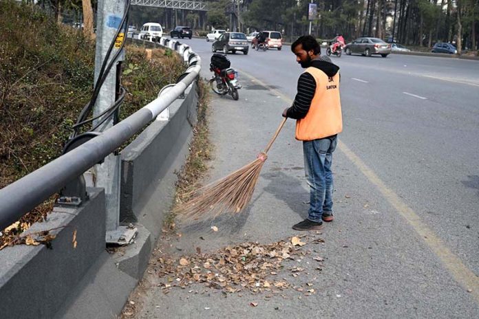 CDA worker is busy cleaning fallen tree leaves from the road in the Federal Capital.