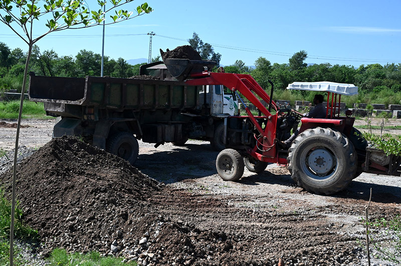 CDA workers clearing ground for planting trees on the greenbelt along Murree road