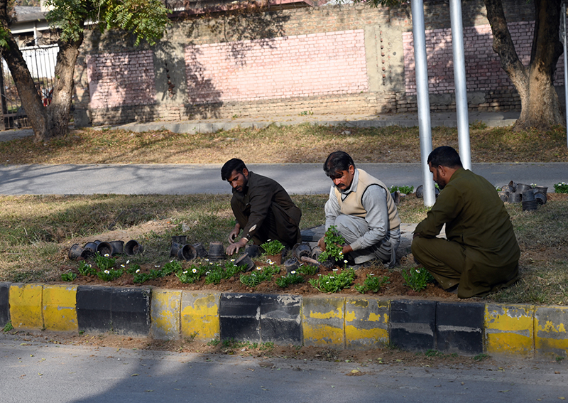 CDA workers plant saplings on the green belt near the fire brigade in the Federal Capital
