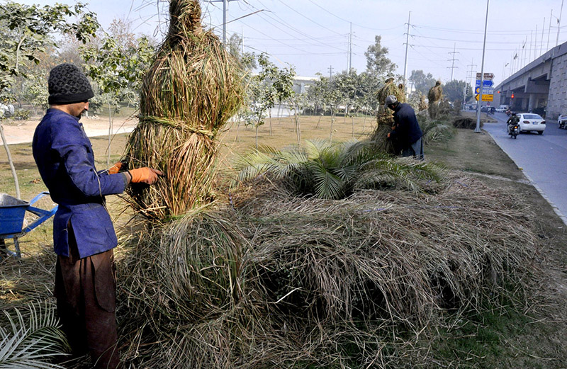 CDA workers wrap the roadside plantlets with fodder to protect them from harsh weather in winter season