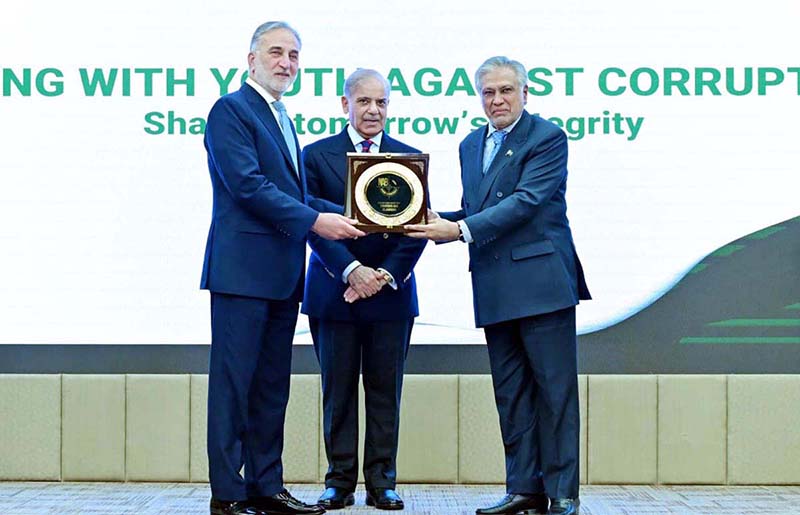 Chairman NAB Lt. Gen (R) Nazir Ahmed giving shield to Deputy Prime Minister, Foreign Minister Muhammad Ishaq Dar at International anti-Corruption Day Seminar.
