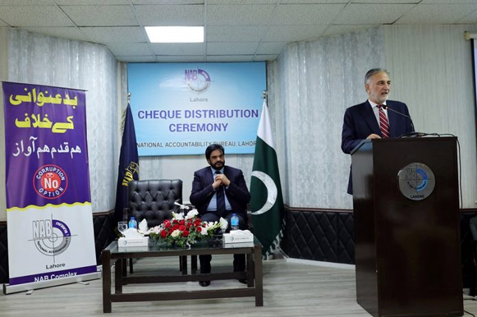 Chairman NAB Lt. Gen. (Retd) Nazir Ahmed addresses the affected individuals of the Suzuki Sialkot Motors case during a cheque distribution ceremony.