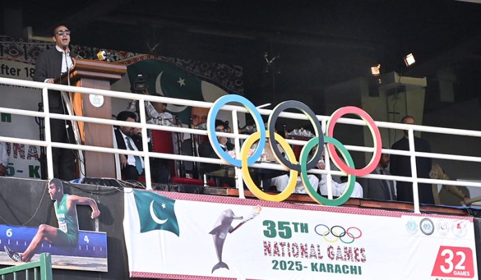 KARACHI: December 06 – Sindh Chief Minister, Syed Murad Ali Shah addressing the opening ceremony of 35th National Games 2025 at National Bank Stadium. APP/SDQ/ABB/FHA