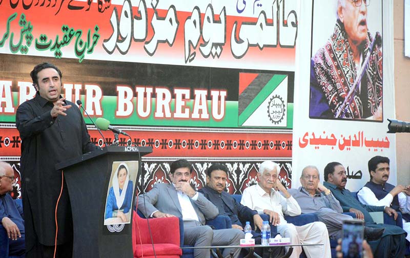 KARACHI: May 01 – Chairman Pakistan People's Party (PPP) Bilawal Bhutto Zardari addressing function organized by People's Labour Bureau Sindh in connection with International Labour Day at Arts Council.