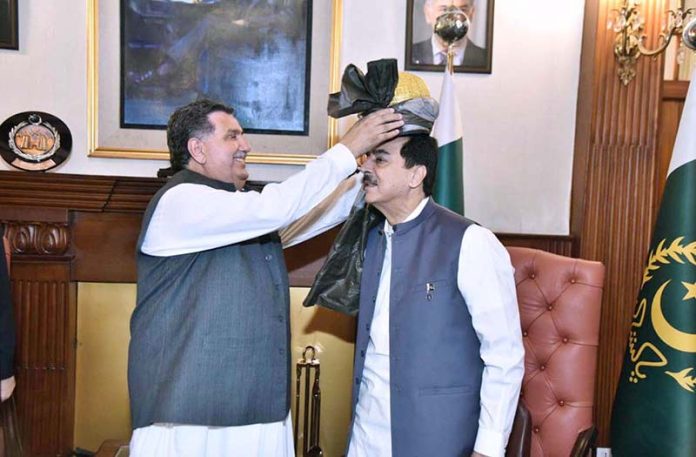 Chairman Pakistan Red Crescent Khyber Pakhtunkhwa, Farzand Ali Wazir presenting a traditional turban to Acting President Syed Yousuf Raza Gilani at Governor House.