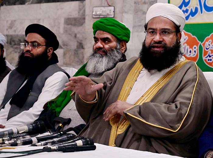 Chairman Pakistan Ullema Council & Special Assistant for interfaith Harmony, Hafiz Tahir Mehmood Ashrafi addressing a Press conference during the “Misaq-e-Pakistan Convention”.
