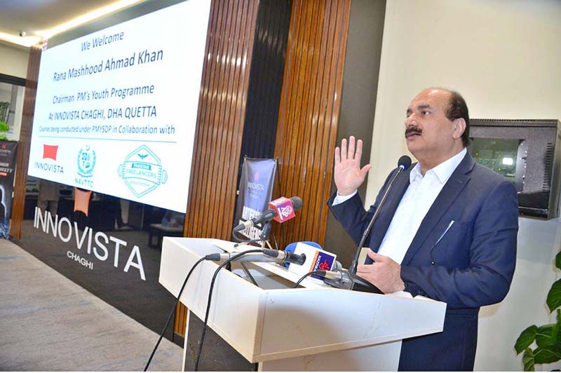 Chairman Prime Minister’s Youth Programme (PMYP) Rana Mashhood Ahmed Khan addresses a ceremony of Innovista Chaghi at DHA Quetta