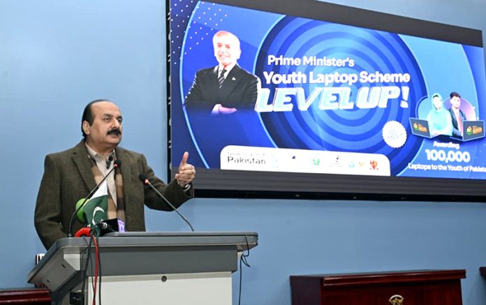 Chairman Prime Minister’s Youth Programme, Rana Mashhood Ahmad Khan, addressing to the students at the Prime Minister’s Youth Laptop Awarding Ceremony in Lahore College Women University.