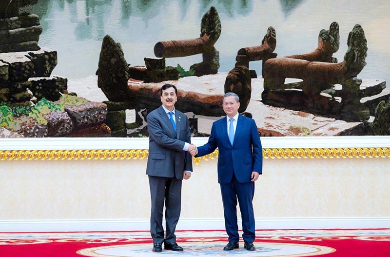 PHNOM PENH: February 04 - Chairman Senate of Pakistan, Syed Yousuf Raza Gilani shaking hands with Samdech Moha Borvor Thipadei Hun Manet, Prime Minister of the Kingdom of Cambodia. APP/MAF/ABB