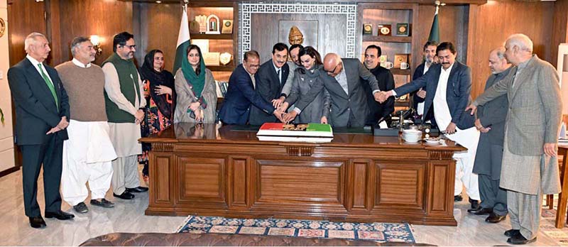 Chairman Senate Syed Yousaf Raza Gilani, along with senators, cuts a cake to mark the 58th Youm-e-Tasees of the Pakistan People’s Party (PPP) at Parliament House